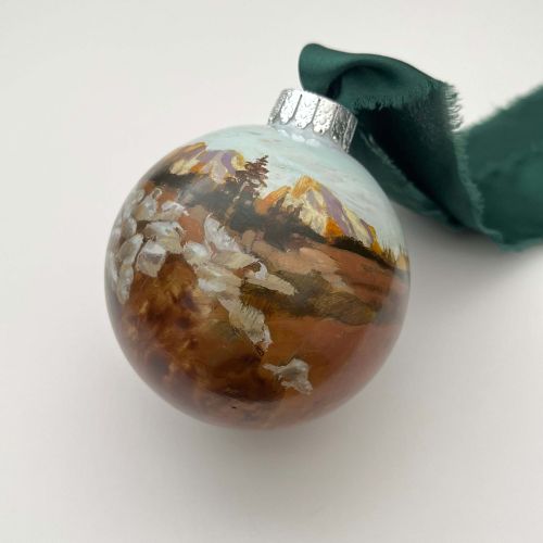 These hand-painted 3-inch frosted bulbs blend abstract backgrounds with thoughtful foreground details, creating a distinctive balance of vintage charm and modern design. Each ornament offers a glimpse of Wyoming’s untamed beauty—from golden landscapes to rugged mountain silhouettes. A timeless keepsake, UV-protected to preserve its character.