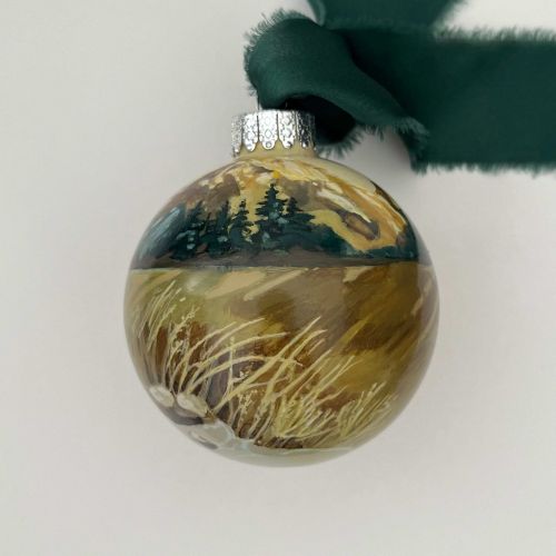 These hand-painted 3-inch frosted bulbs blend abstract backgrounds with thoughtful foreground details, creating a distinctive balance of vintage charm and modern design. Each ornament offers a glimpse of Wyoming’s untamed beauty—from golden landscapes to rugged mountain silhouettes. A timeless keepsake, UV-protected to preserve its character.