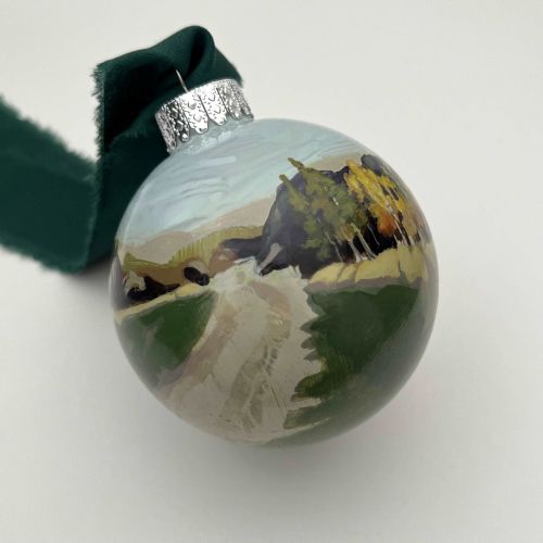 These hand-painted 3-inch frosted bulbs blend abstract backgrounds with thoughtful foreground details, creating a distinctive balance of vintage charm and modern design. Each ornament offers a glimpse of Wyoming’s untamed beauty—from golden landscapes to rugged mountain silhouettes. A timeless keepsake, UV-protected to preserve its character.