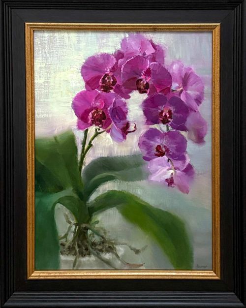 "Painted from live flower set up using filbert brushes, palette knife and occasionally my finger with much joy and happiness" - Stacy Barter